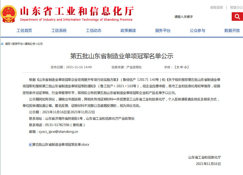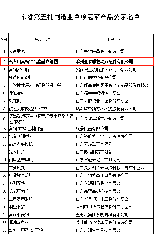 2021年11月16日,山东省工业和信息化厅公示了第五批山东省制造业单项冠军名单,我司主导产品——汽车用高端铝活塞耐磨镶圈获批“山东省制造业单项冠军产品”。这是我司今年喜获国家级“专精特新”小巨人企业后,喜获的又一殊荣。
